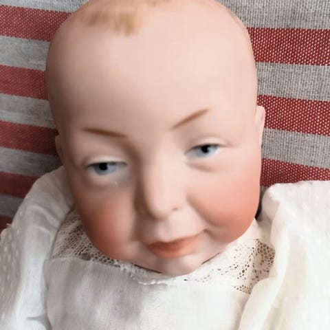 Bisque-ansigt, brune glas sovøjne, malede øjenvipper, indgraveret eyeliner, penselstrøgede øjenbryn med fjerede højdepunkter, fremhævede næsebor og øjenhjørner, lukket mund med skygge- og fremhævede læber, blond mohair-paryk over gips hoved, tidligt sammensat og træledet krop med lige håndled. Hun bærer en original rød bomuldskjole med matchende hat, undertøj, originale strømper og lædersko.