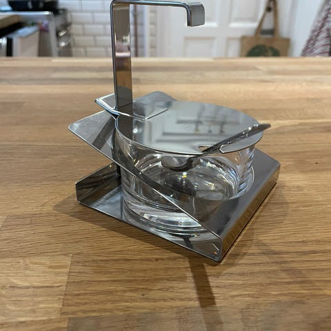 Den viste genstand er en Cantoni Parmesanreibe. Denne rotationstrille i mid-century design stammer fra Italien, typisk fra 1960'erne.
