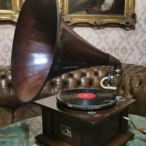 Grammofonen med udstillingsreproducer, og dermed med smuk lydgengivelse.