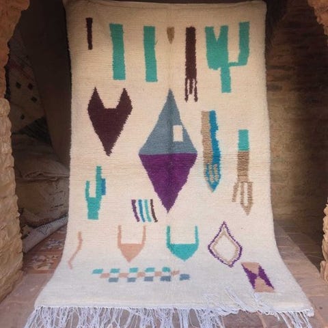 Ny Mrirt-tæppe, håndvævet i Mrirt-regionen i Marokko. Med dimensionerne 252 × 160 cm er det lavet af høj kvalitets naturlig uld, kendt for sin enestående blødhed og komfort under fødderne. Dette tæppe skiller sig ud med sin tætte vævning, bløde tekstur og omhyggelige finish. Det elegante og tidløse design passer let ind i et moderne, boheme- eller minimalistisk hjem. Nyt og aldrig brugt, bringer det varme, autenticitet og raffinement til en stue, et soveværelse eller et opholdsrum.