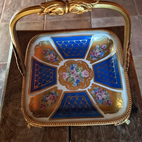 Smukt Limoges-porcelænsfad omgivet af en hank og støtte i forgyldt metal