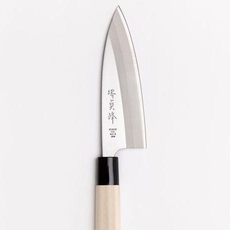 Dette er en traditionel japansk Deba-kniv lavet af højkvalitetsstål med et træhåndtag. Kniven er håndsmiddet og inkluderer et hånd-engraveret mærke, der signalerer dens håndværk.