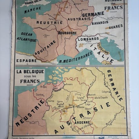 Autentisk fransk vægkort med titlen La Période Bourguignonne (1476), der illustrerer omfanget og indflydelsen af de bourguignonske stater i slutningen af det 15. århundrede. Dette plakatsæt var tiltænkt undervisning i historie og politisk geografi i skolerne.