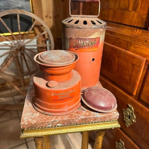Den bærbare kerosenbeholder i blik og messing, oprindelse Italien, er i god brugt stand med små aldersmærker. Klik på den blå "gå til varen" knap, for at købe eller byde på denne vare. Den samlede pris vil blive vist inden du afgiver dit bud.