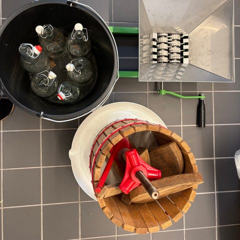 Auktionens genstand er en 1800-tals træostpresser. Den er håndlavet og har smukke originale skruer med møtrikker.