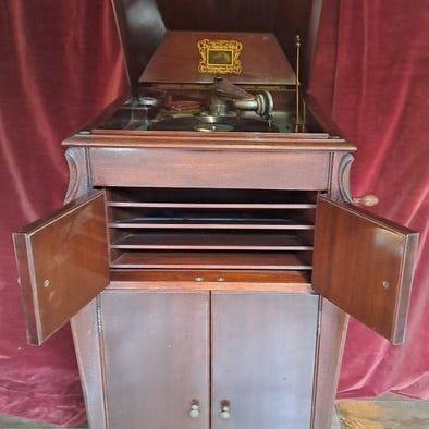 Dette parti indeholder en original 1909 HMV (His Master’s Voice) Monarch Junior hånddrevet grammofon, produceret i Storbritannien. Det er en tidlig bordmodel med ekstern horn, bærer det ikoniske “His Master’s Voice” hunde-logo, et af de mest genkendelige symboler i historien om optaget lyd.