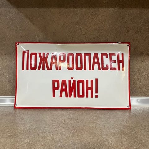 40 x 20 cm emaljeret jernskilt med inskriptionen "Sted til rygning" (място за пушене - myasto za pushene). Dette skilt er et autentisk artefakt fra kommunisttiden i Bulgarien, hvilket afspejler den omhyggelige regulering af offentlige og arbejdspladsers miljøer under statens kontrol. Skilte som dette blev almindeligvis fundet i fabrikker, administrative bygninger og andre institutionelle omgivelser for at angive udpegede rygeområder. Det emaljerede jernskilt er i fremragende stand med en skinnende overflade, der modstår tidens tand godt. De