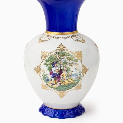 Dekorativ porcelænskop med fint guldbelag fra Karlsbader, ca. 1950–1960, Tyskland, mål 13,4 cm bred, 21,5 cm høj og 33,5 cm dyb, i god stand med aldersrelateret slid og pletter. Klik på den blå "gå til varen" knap, for at købe eller byde på denne vare. Den samlede pris vil blive vist inden du afgiver dit bud.