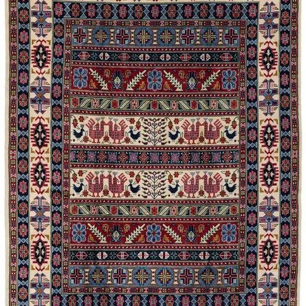 Smukt håndknyttet tæppe af uld. Katoenen er naturligt farvet uden kemikalier. Hovedfarven er rød, creme, blå og grøn. Tæppet er med smuk, professionel og stram knytning og har korte frynser.