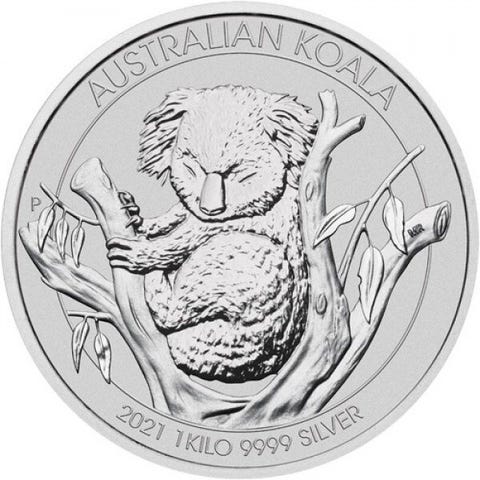 Kilo Koala sølvmynter for 2023 fra Australien præsenterer et fængslende design, der fanger essensen af de elskede søvnige væsner. Årets design tager det til nye højder med en hypnotiserende skildring af en koala og dens afhængige unge 'joey', der klamrer sig til dens ryg højt oppe i gumtræets baldakin. Baksiden af mynten viser inskriptionen 'KOALA', The Perth Mint's 'P'-møntmærke og angiver myntens vægt, renhed og årstal. Som lovlig betalingsmiddel under Australian Currency Act