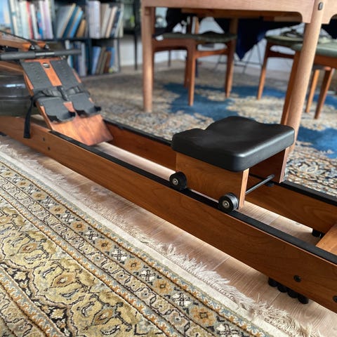 WaterRower træningsromaskine med vandmodstand, træramme og digital display. Romaskinen er designet til at simulere rotræning og giver modstand via et vandfyldt hjul. Udstyret med justerbare fodstropper og komfortabelt sæde. Velegnet til hjemmetræning.