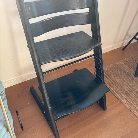 Sælger to originale Tripp Trapp® højstole i sort, designet af Peter Opsvik. Et ikonisk, tidløst møbel som vokser med barnet og kan bruges i mange år – både som højstol og senere som almindelig stol.