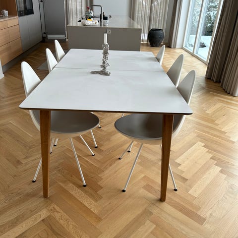 Pænt og velholdt højtrykslaminat spisebord med almindelige brugsspor, men meget velholdt. Hvidt med sort kant og stålben. Længde uden tillægsplader: 158 cm. Bredde 105 cm. Højde 72 cm (justerbart). 2 tillægsplader på hver 50 cm. Bordet er vist med en tillægsplade i.