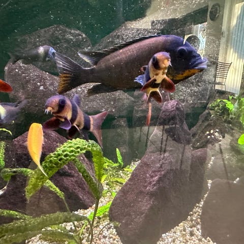 Labeotropheus Trewavasae F2 gruppe. Købt som værende "Mitande" men sælger dem blot som de "De blå med rød rygfinne". Se den lave pris.