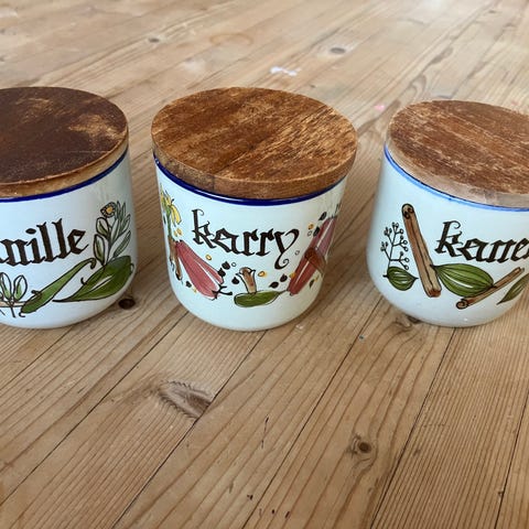 Samlet pris 50kr. 3 krukker højde 7 cm inkl teak låg
