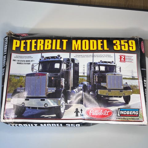 Revell Peterbilt 359 Conventional modelbil byggesæt i skala 1:16. Sættet indeholder dele til samling af en detaljeret model af en Peterbilt 359 lastbil med farverige dekaler og instruktioner til montering.