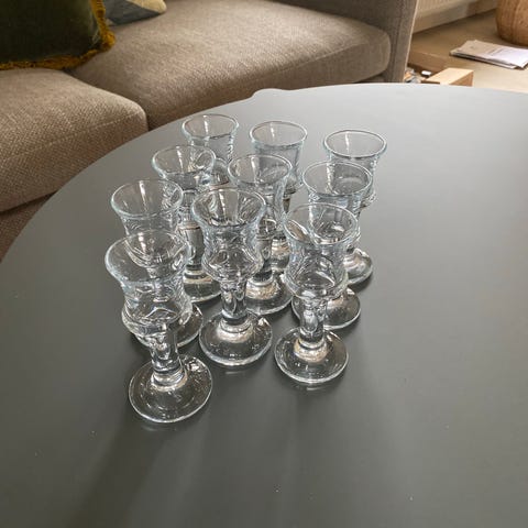 Holmegaard skibsglas portvin. Sæt af 6 klare snapseglas, lavet af glas. Hver snapglas har en diameter på 5 cm og en højde på 10 cm. Glassene er velegnet til servering af shots eller små drikkevarer, perfekt til festlige lejligheder eller som en del af en barsamling. I god stand, uden synlige ridser eller skader.