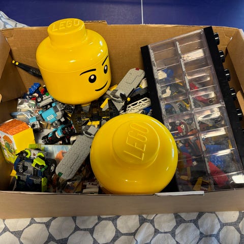 14 kilo LEGO klodser og dele i opbevaringsboks med en kapacitet på 80 liter. Indeholder forskellige farver og typer af LEGO klodser og dele.