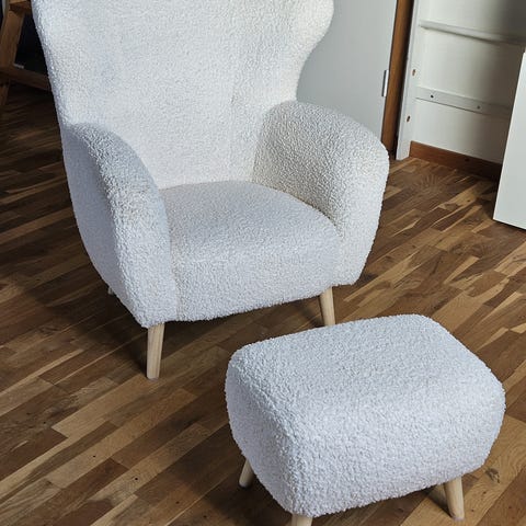 Lænestol i teddy fra Ilva, betrækket på hynden kan tages af og vaskes. Den er brugt, men står fint og har massere af tid i sig endnu.