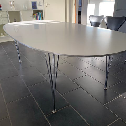 Piet Hein Bruno Mathson Ellipse sofa bord fremstillet hos Fritz Hansen 4 spændben forkromet stål alle 4 benene har ryst Hvid laminatbordplade har aluminiumskant kun brugtslit ikke rise meget pænt overplade