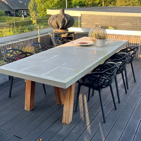 Bordet og bænken er lavet i massivt recycled teaktræ.