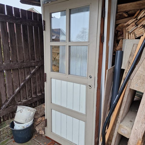 Sort og hvid trædør med glasparti og krydsdetaljer