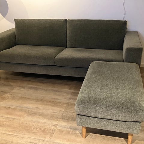 Ilva Asmussen sofa i mørk stof. Sofaen har en enkel og funktionel udformning, velegnet til daglig brug.