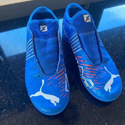 Puma fodboldsko i størrelse 37,5 med blå farve. Skoene er designet til fodbold og har en hvid sål med mønster til indendørs brug.