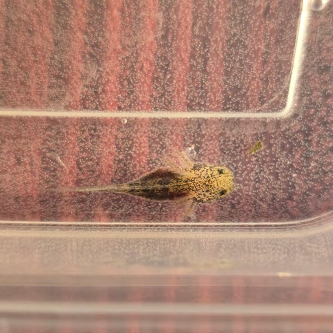 Sund og aktiv. Hun spiser godt. Hun har fået frosne myggelarver, tørfoder og regnorme fra køber (Ikke fra haven, da de kan have sygdomme)