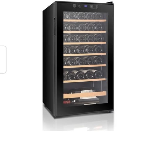 Vinoteca vinkøleskab med kapacitet til 12 flasker. Sort kabinet med glasdør, egnet til opbevaring af vin ved kontrolleret temperatur.