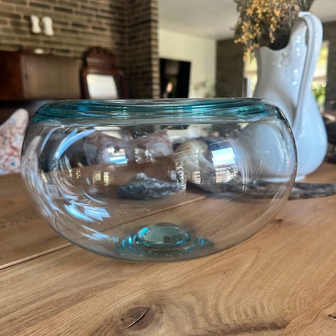 Stor glasvase med en diameter på 28 cm. Vasen har en transparent finish og en rund form. Den kan bruges til blomsterdekorationer eller som en skulpturel dekoration i hjemmet.