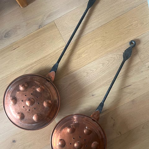 Dette er en klassisk kobber varme pande med et dybt låg og et langt trahåndtag. Panden er 45 cm lang og 13 cm bred, inklusiv håndtaget. Den bruges normalt til at varme op senge eller mellem lagene af tekstiler for ekstra varme i kolde måneder. Kobber er kendt for dets gode varmeledningsevne og ovenstående er et dekorativt mønster. Det er ideelt til vintage eller antikke interiører.