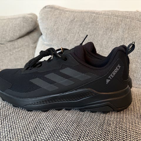 Adidas Terrex vandresko i størrelse 38,5. Stort set ikke brugt. Skoene er lavet med en slidstærk gummisål, der giver godt greb på forskellige terræner. Ydersiden er lavet af mesh og syntetiske materialer for optimal åndbarhed og støtte. De har også snøre, der sikrer en god pasform under brug. Brandets logo og tre striber er synlige på siden af skoen.