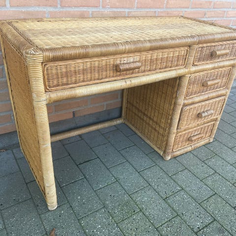 Skrivebord med flet og jernstel og stol med flet og jernstel sælges samlet.