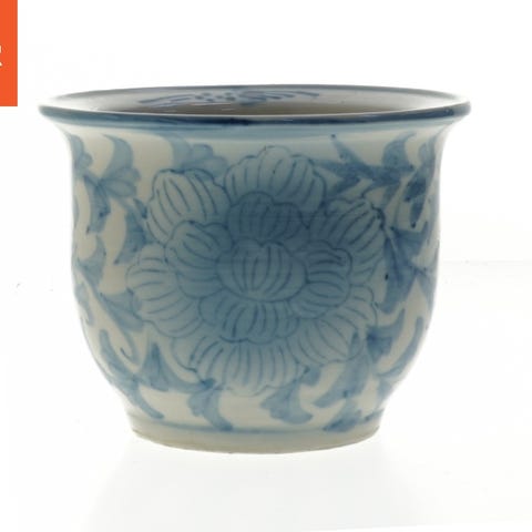 Denne ældre urtepotte er fra kina har et traditionelt blåt og hvidt motiv og mønster. Potten er designet med en enkelt hank, og dens dimensioner er 11cm høj og 24 cm i diameteren. Det indvendige af kummeren er lysegrønt, mens det ydre har et dekorativt blåt landskabsmønster. Bunden har et stempel, der indikerer mulig oprindelse. Tag: asiatisk porcelæn, blåt mønster