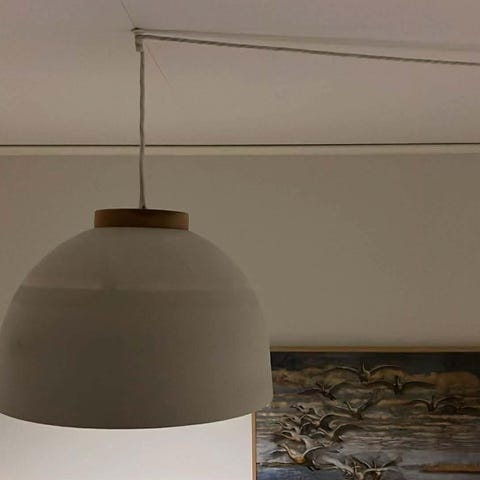 Diameter ca. 46cm og ca. 35cm høj. Pendellampe passer perfekt over et spisebord eller i gangen.