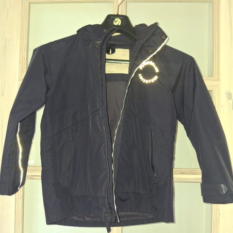 Regnjakke i blå farve med lange ærmer og hætte. Jakken har lyseblå ærmer med et mønster og en trykt logo på brystet og bagsiden med teksten 'Airborne'. Jakken har to sidelommer.