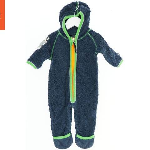 En blå heldragt med korte ærmer og stjernemønster i forskellige farver. Dragten har røde syninger og har trykknapper i bunden. Mærket Molo er synligt ved halsen.