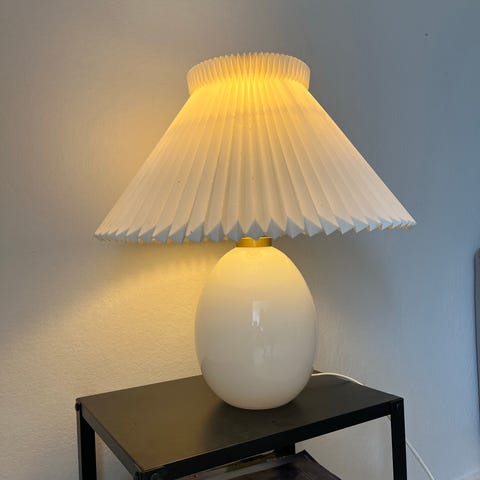 Bordlampe med brugstegn. Den vipper lidt til den ene side, og har et par mærker.