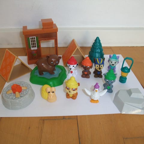 Et sæt af små, paw patrol figurer og tilbehør med juletema. Sættet inkluderer forskellige figurer som en snemand, flere dyr, og karakterer iført vintertøj. Der er også juledekorationsdele som en lille luge, en vogn, en grøn slæde, og en hytte. Farverne er lyse og varierede, primært røde og grønne. Dette sæt er ideelt til børns leg og som juleudsmykning.