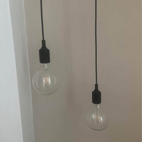 Muuto E27 pendel i grå. Industriel pendel lampe inkluderet med en stor glødepære. Pæren har en diameter på 12 cm og er sat i en fatning med en lang ledning. Pære fra Ikea.