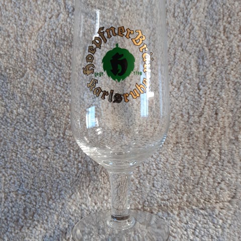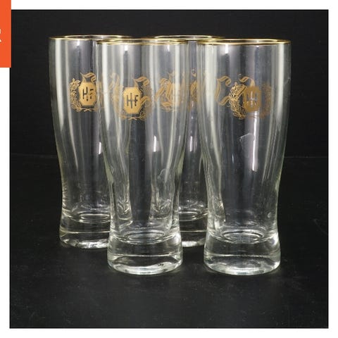 Sæt med fire ølglas, hver med en højde på 17 cm. Glassene har en elegant guldkant og et dekorativt emblem med initialerne 'HF'. De er gennemsigtige og velegnede til servering af øl eller andre drikkevarer.