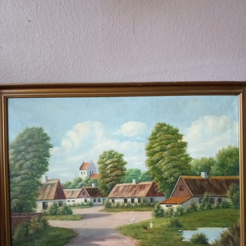 Maleri med motiv af et landskab, der viser et hus og træer. Maleriet er udført på lærred og indrammet i en træramme. Farverne inkluderer grønne, blå og brune nuancer.