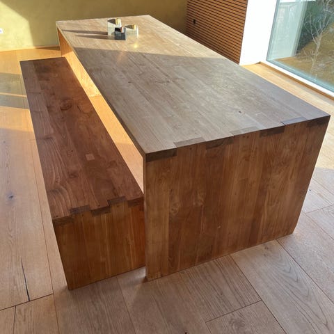 Muubs Rockefeller bord inklusiv 6 stk stole, bordbukke er lavet af recycled teaktræ.