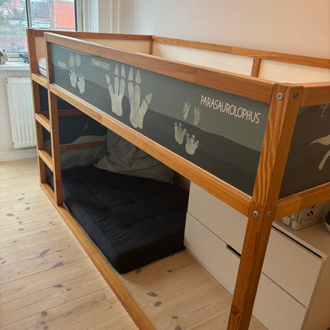 IKEA Højseng til børn i træmateriale med plads under sengen til leg eller opbevaring. Sengen er designet til at spare plads i børneværelset og kan kombineres med forskellige tilbehør såsom gardiner eller legetelte.