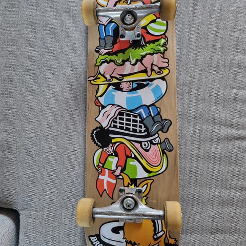 TSP skateboard med hjul og trucks. Skateboardet er i str. 8.8 og har mobgrip på. Trucks er grundet til, men der er stadig masser af liv tilbage. Hjulene er dragons og spritnye. Har samlet det at dele vundet til konkurrencer.