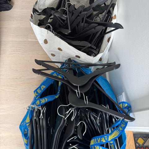 Sorte plastbøjler kan låse tøj fast, så det kan udstilles ude på gaden på et tøjstativ. Bøjlerne er næsten ikke brugt. Købt hos Alpa Security