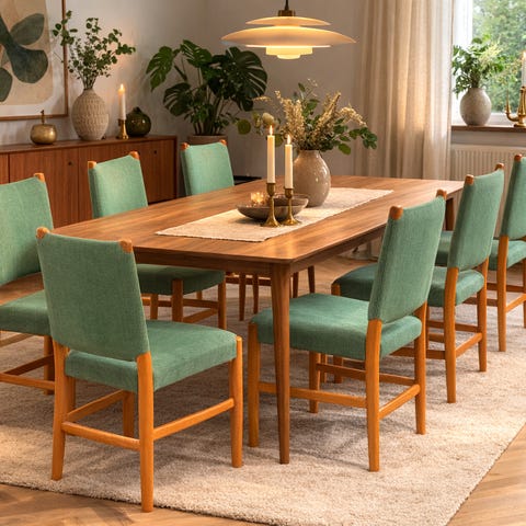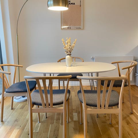 Selling a set of 6 oak dining chairs with a clean Scandinavian / mid-century inspired design. Beautiful natural oak tone, elegant curved backrest, and very comfortable seats — perfect for a dining table, kitchen, or studio space.