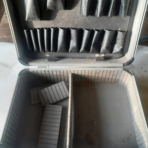 Blå og sort plastkuffert med skumindlæg