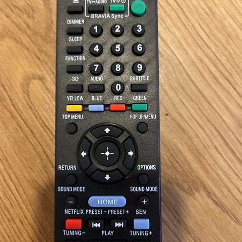 Sony RM-ADP072 AV System fjernbetjening med knapper til volumen, tuning, display, pause, stop, mute, TV input, og navigation.